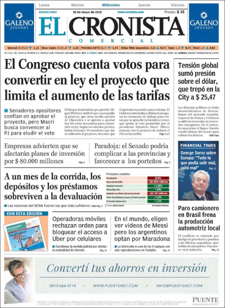Las tapas del miércoles 30 de mayo: La despedida de la Selección y la votación por las tarifas en el Senado