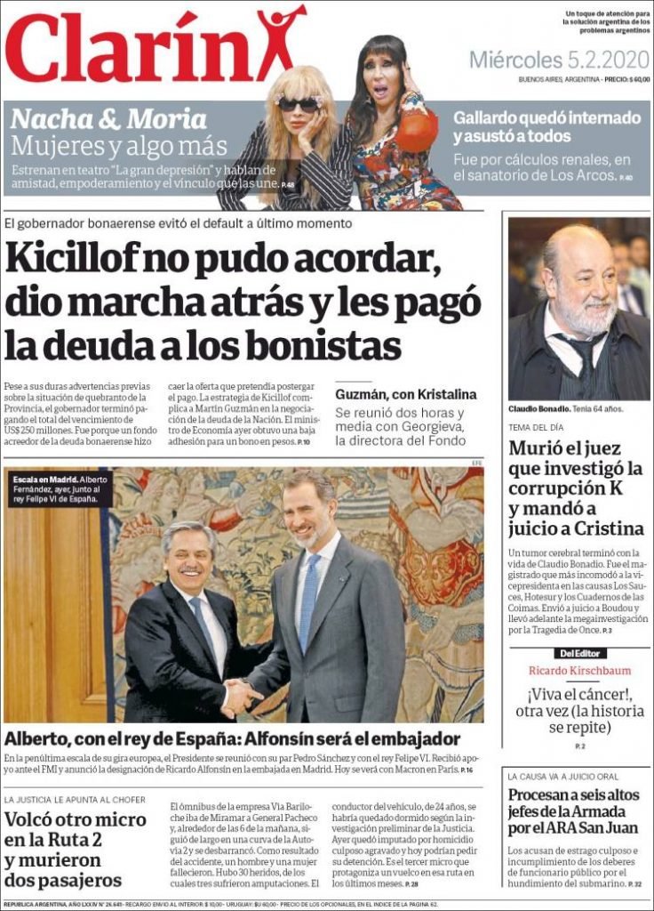 Las tapas del miércoles 5: Kiciloff al final pagó el bono para evitar el default