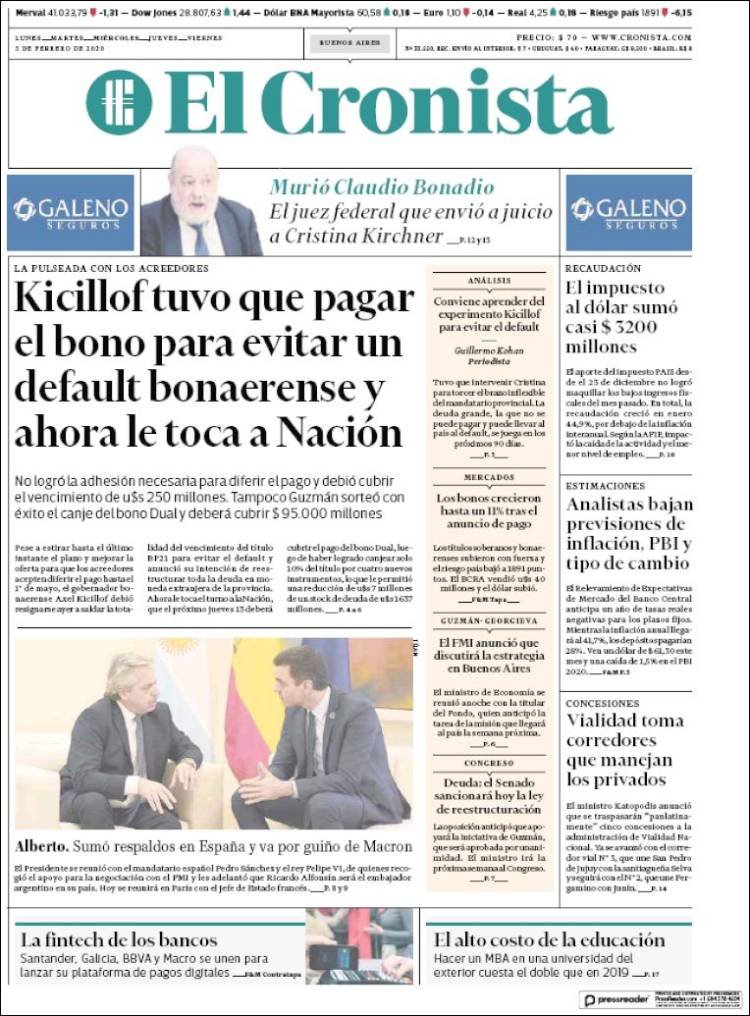 A continuación, repasamos las tapas de los diarios del miércoles 5 de febrero. Axel Kiciloff, el gobernador bonaerense, decidió pagar la totalidad del bono que intentaba renegociar con los acreedores. De esta manera, evitó el default bonaerense.