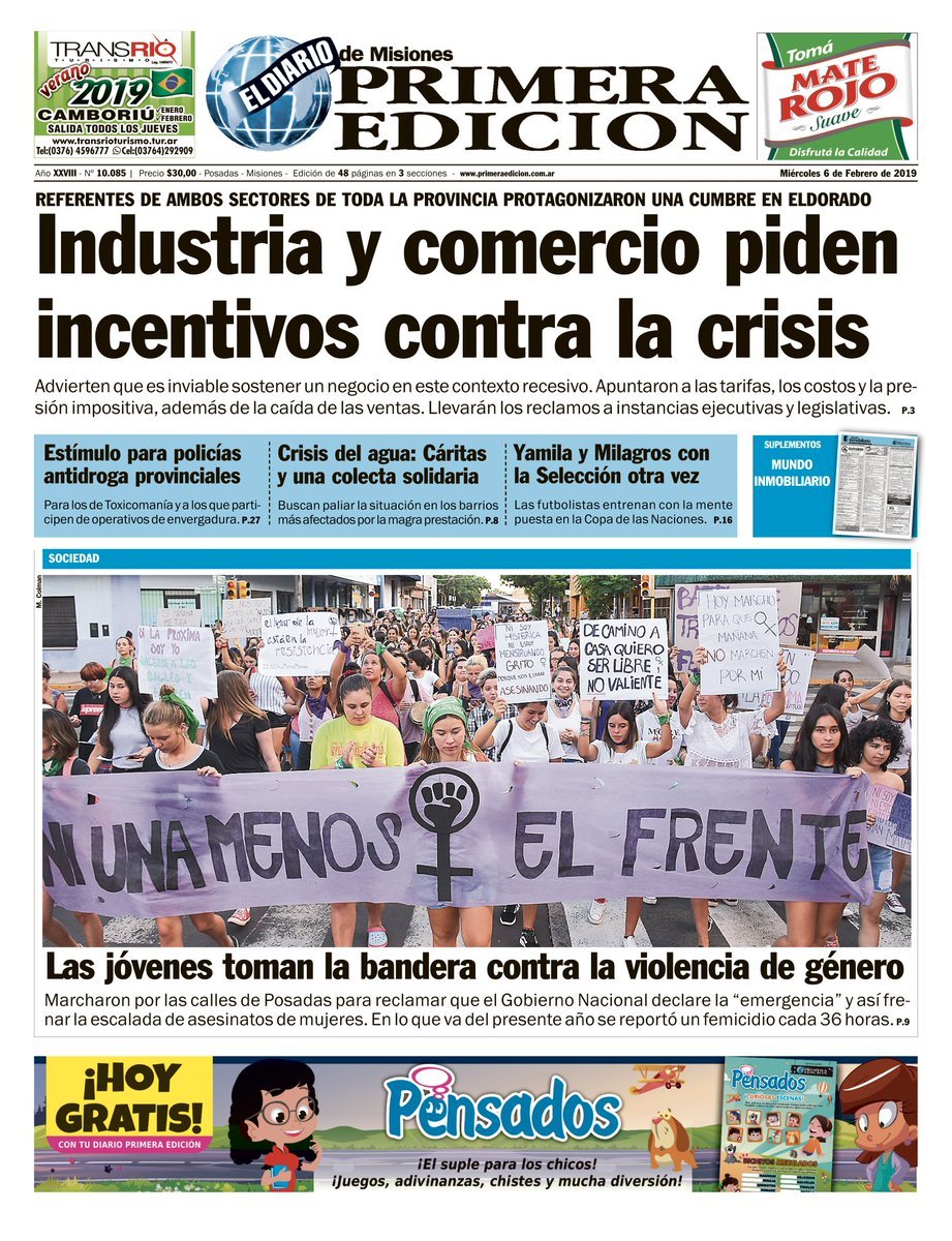 Las tapas del miércoles 6: La caída en la industria y la construcción; las empresas en crisis y las jóvenes salen a la calle