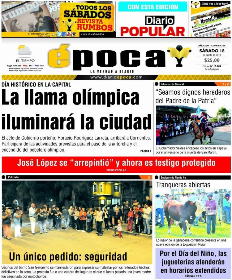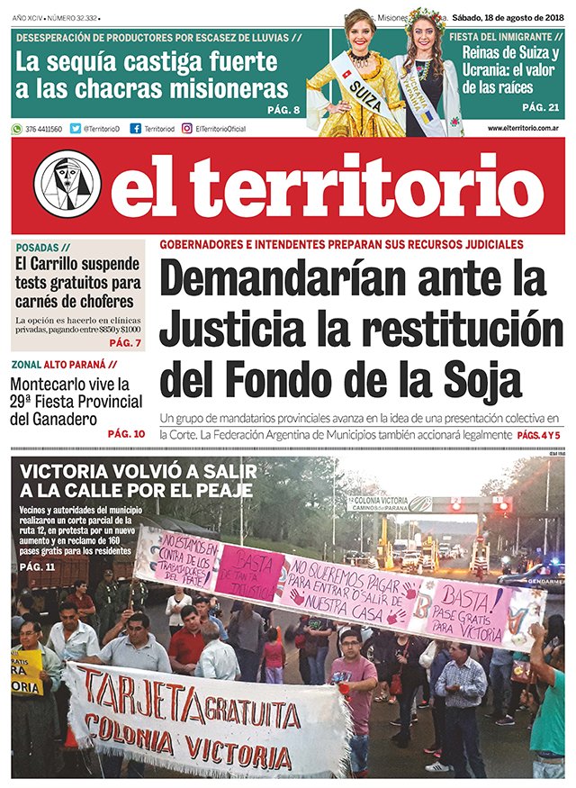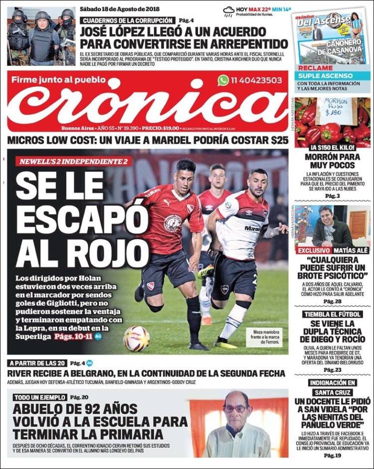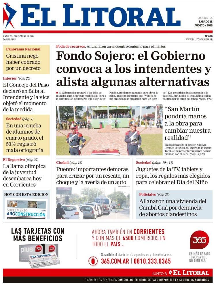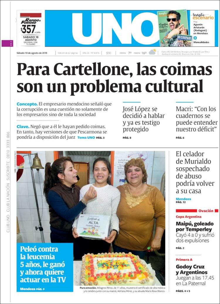 A continuación reproducimos las tapas de los principales diarios del país. Los arrepentidos empresarios y políticos siguen siendo la noticia de la semana. La crisis económica sigue golpeando y un grupo de gobernadores busca recuperar el Fondo solidario de la Soja a través de la Justicia.
