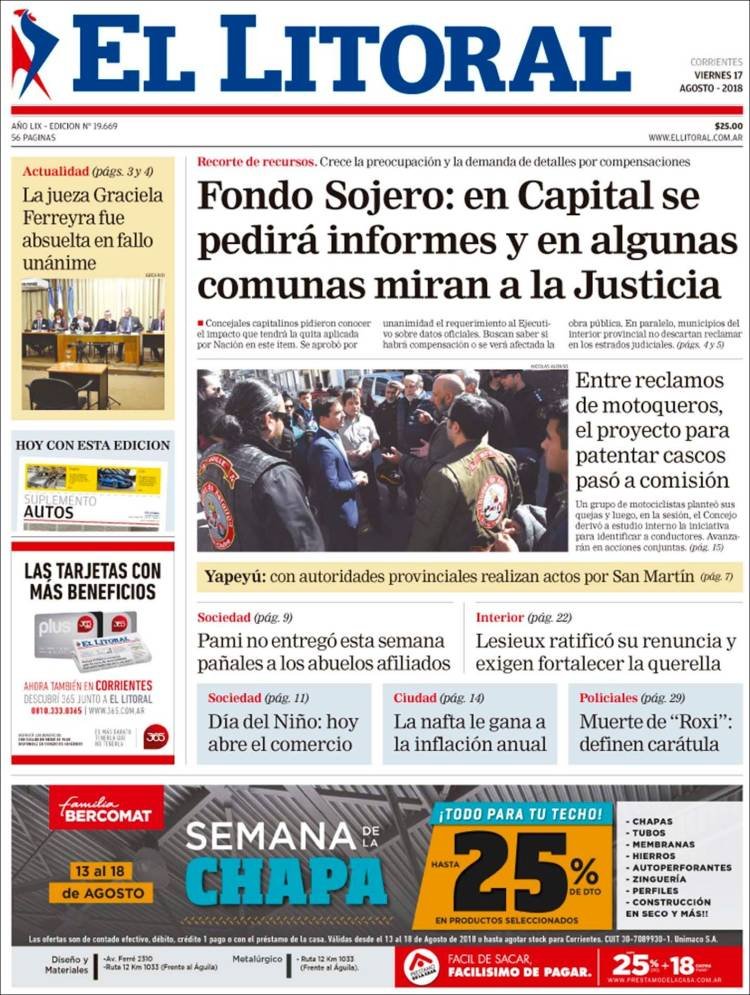 A continuación reproducimos las tapas de los principales diarios del país. Gobernadores, legisladores e intendentes siguen reclamando por la restitución o compensación del fondo solidario de la soja. Una medida que impacta directamente en las finanzas de las comunas.