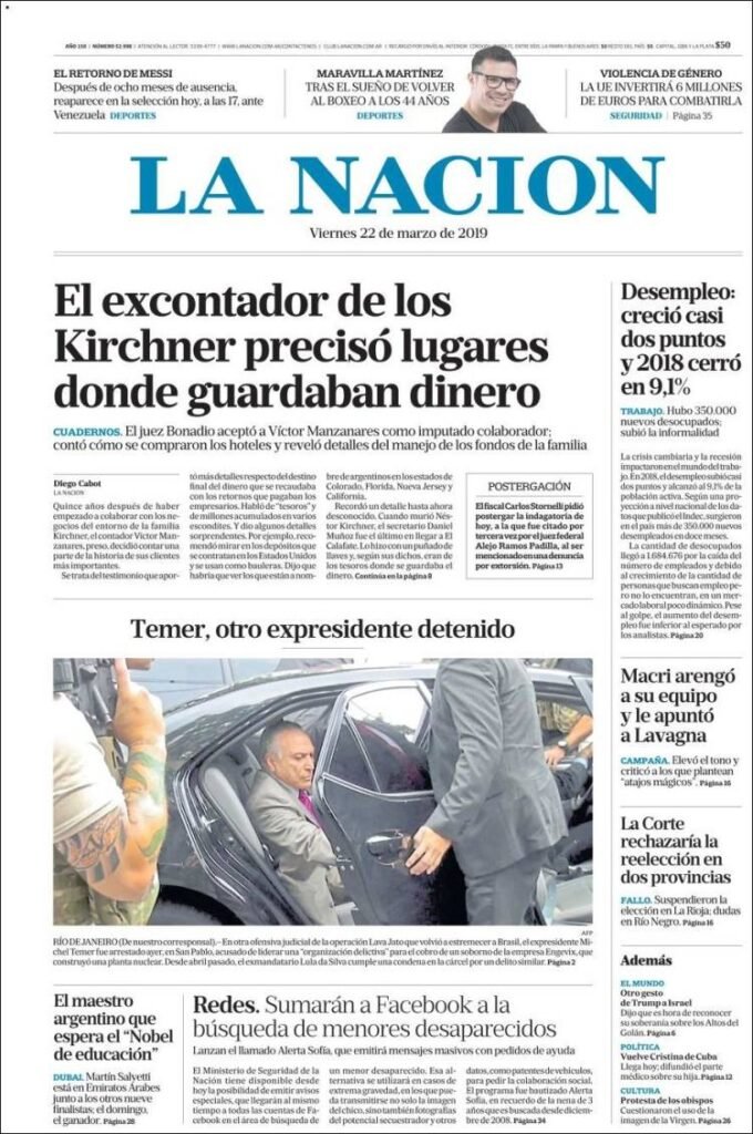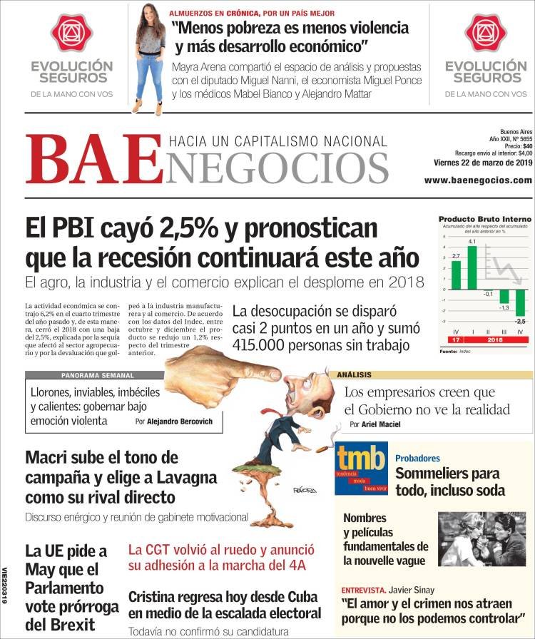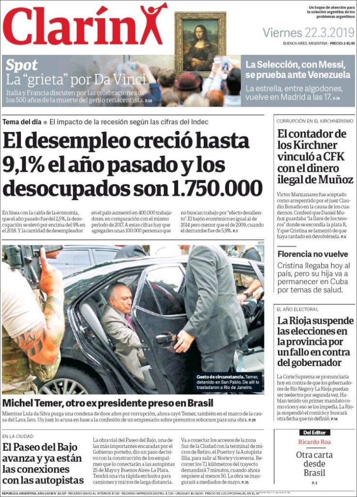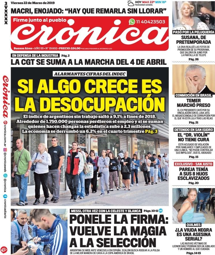 A continuación reproducimos las tapas de los principales diarios del país. Los datos del Indec sobre desempleo y actividad económica fueron otro duro golpe de realidad para el Gobierno de Cambiemos. Si bien se esperaba una desocupación de dos dígitos, el promedio quedó en 9,1 por ciento para el ultimo periodo del 2018.