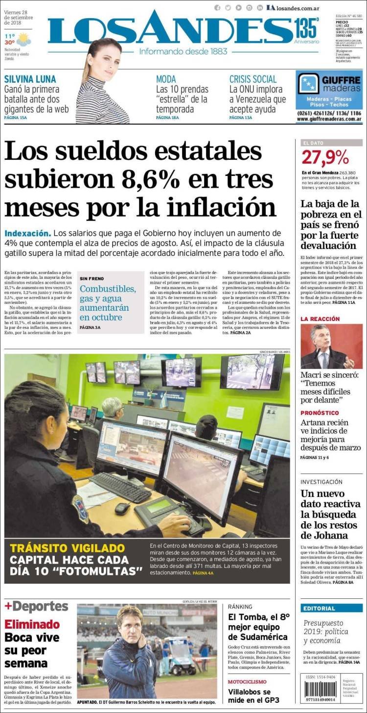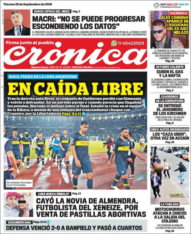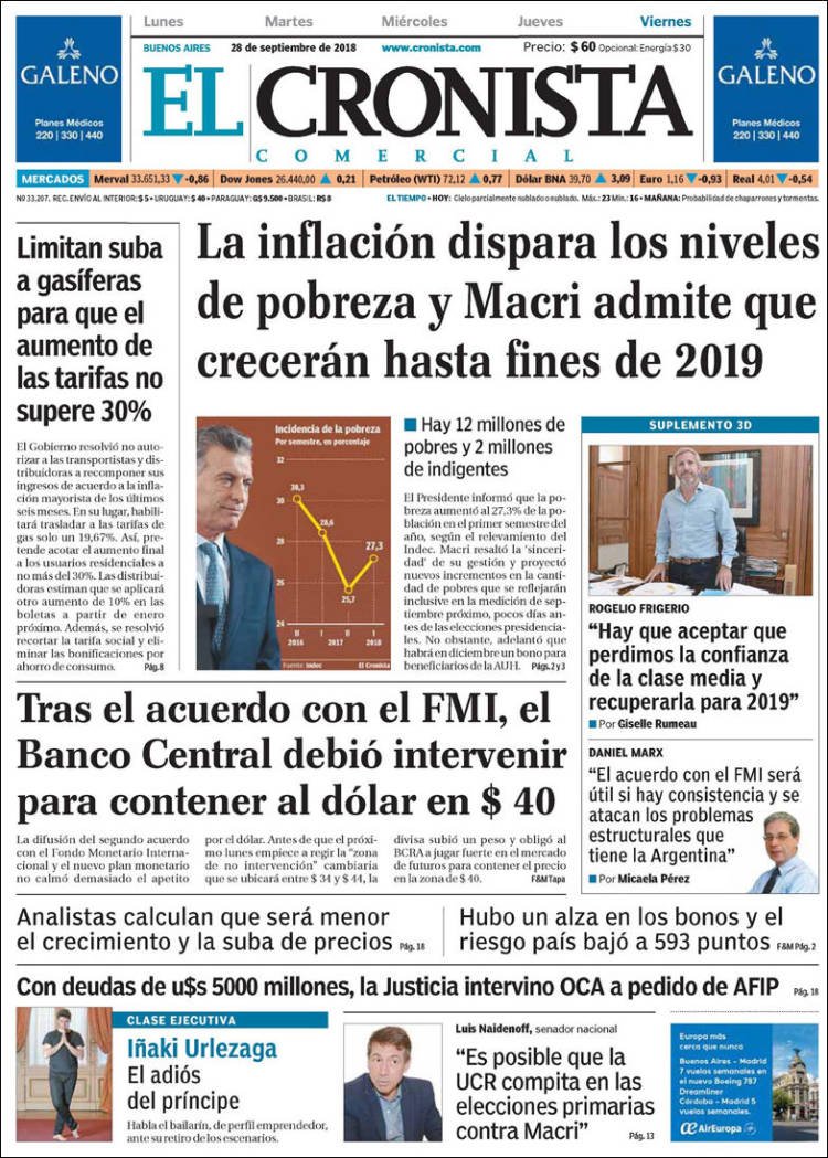 A continuación reproducimos las tapas de los principales diarios del país. El dato del Indec marcó que la pobreza creció un 1,6 por ciento en el primer semestre del año. Aunque el presidente Macri insiste en que se reducirá, se descarta que el informe del segundo semestre sea más grave porque reflejará lo peor de la devaluación de este año.