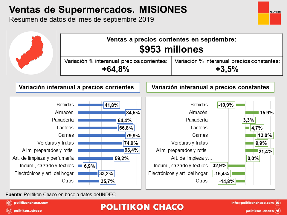 En septiembre las ventas en supermercados en la Argentina cayeron por decimoquinto mes consecutivo y disminuyeron 8,8% interanual, pero en Misiones, crecieron 64,8 por ciento, contra una inflación promedio del 55,7 por ciento en el NEA. Ese 64,8 fue el dato más alto de todo el país, mientras que, comparado con agosto, el consumo creció un 4,7%, siempre medidos a precios corrientes, señala la consultora Politikon Chaco. Misiones fue la única provincia de toda la Argentina que tuvo un incremento interanual: creció un 3,5%