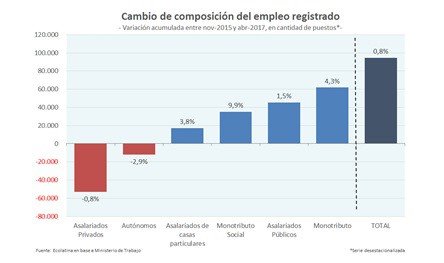 El mercado laboral argentino se está reconfigurando. Desde noviembre de 2015 a abril de 2017 el empleo registrado creció, en términos desestacionalizados, 0,8%. Es decir que en lo que va de gestión Mauricio Macri, 95 mil trabajadores se sumaron al mercado formal. Pero además, detrás de este magro crecimiento se esconde un cambio en la composición que no es menor, en tanto se observa una evolución diferenciada del empleo de acuerdo al tipo de contratación.