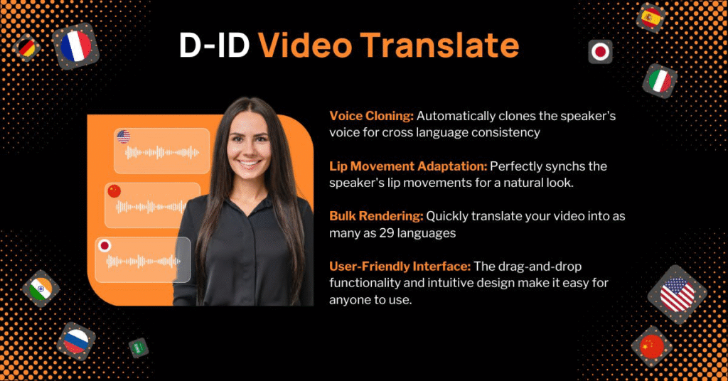 - Clonado de voz y sincronización de labios: Mantiene los movimientos de la boca y el tono natural después de la traducción.