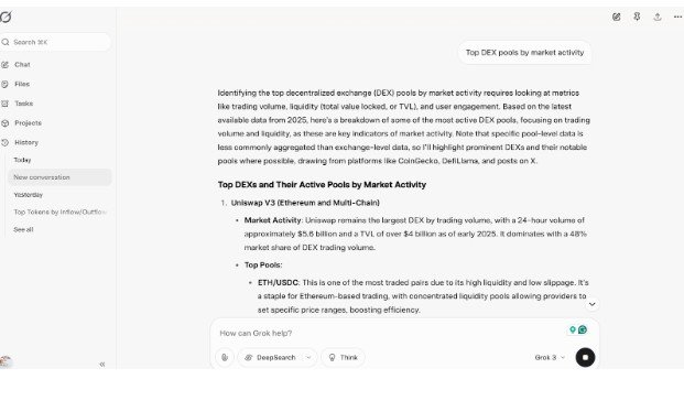 En respuesta a nuestra consulta “Principales pools de DEX por actividad de mercado”, Grok proporcionó información básica con una profundidad mínima. Los datos pueden ser adecuados para que los principiantes obtengan una comprensión general del panorama, pero la información no es ideal para un uso más profesional.