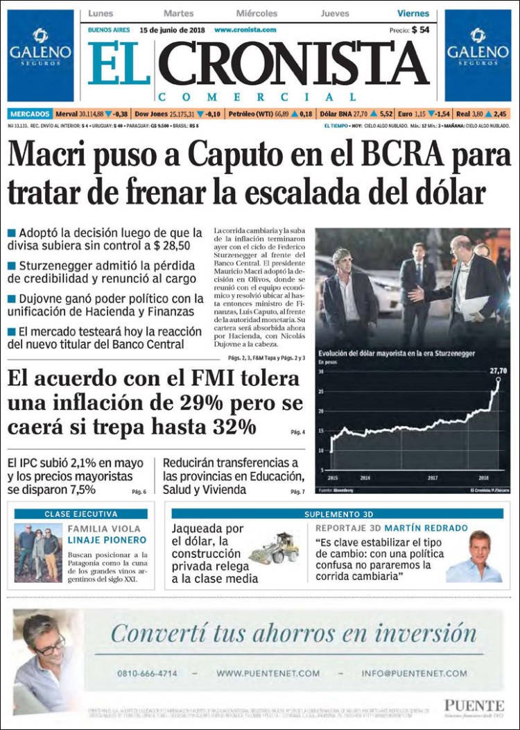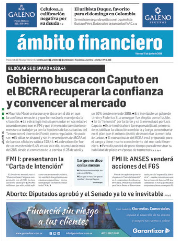 A continuación reproducimos las tapas de los principales diarios del país. Dos temas fueron los principales, por un lado la sesión histórica en Diputados y por otro la corrida del dólar que terminó con el desplazamiento del presidente del BCRA Federico Sturzanegger.