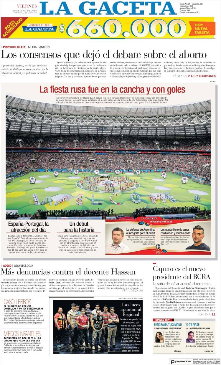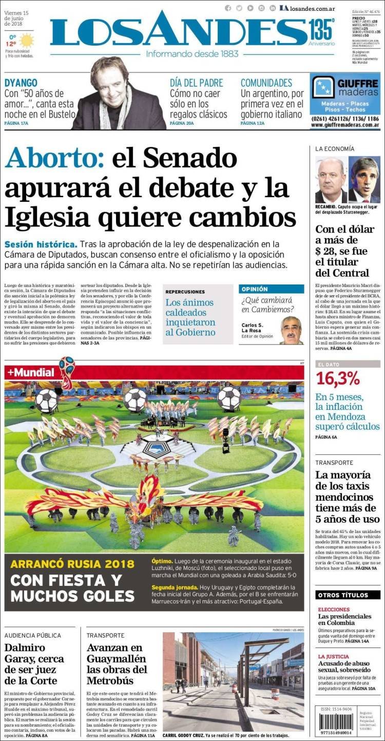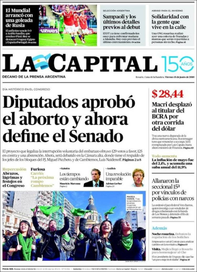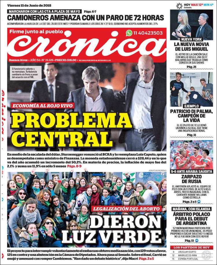 Los diarios del viernes 15/6: La despenalización del aborto, Caputo al BCRA y el Mundial