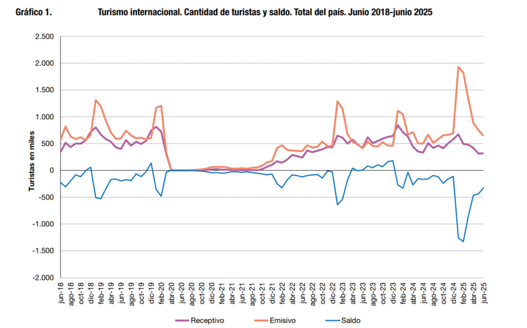 En el primer semestre, los argentinos gastaron USD 3.847,9 millones en viajes al exterior, mientras que los turistas extranjeros dejaron USD 1.518,5 millones en el país. Solo en junio, 1,2 millones de argentinos viajaron al exterior, frente a 542 mil extranjeros que visitaron la Argentina, una brecha que continúa ampliándose.