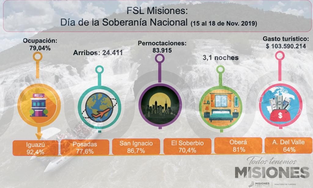 Según datos brindados por el Ministerio de Turismo de Misiones, la ocupación de alojamiento en la provincia el fin de semana largo alcanzó un 79,04%; 5 puntos por encima del mismo fin de semana del año 2018.