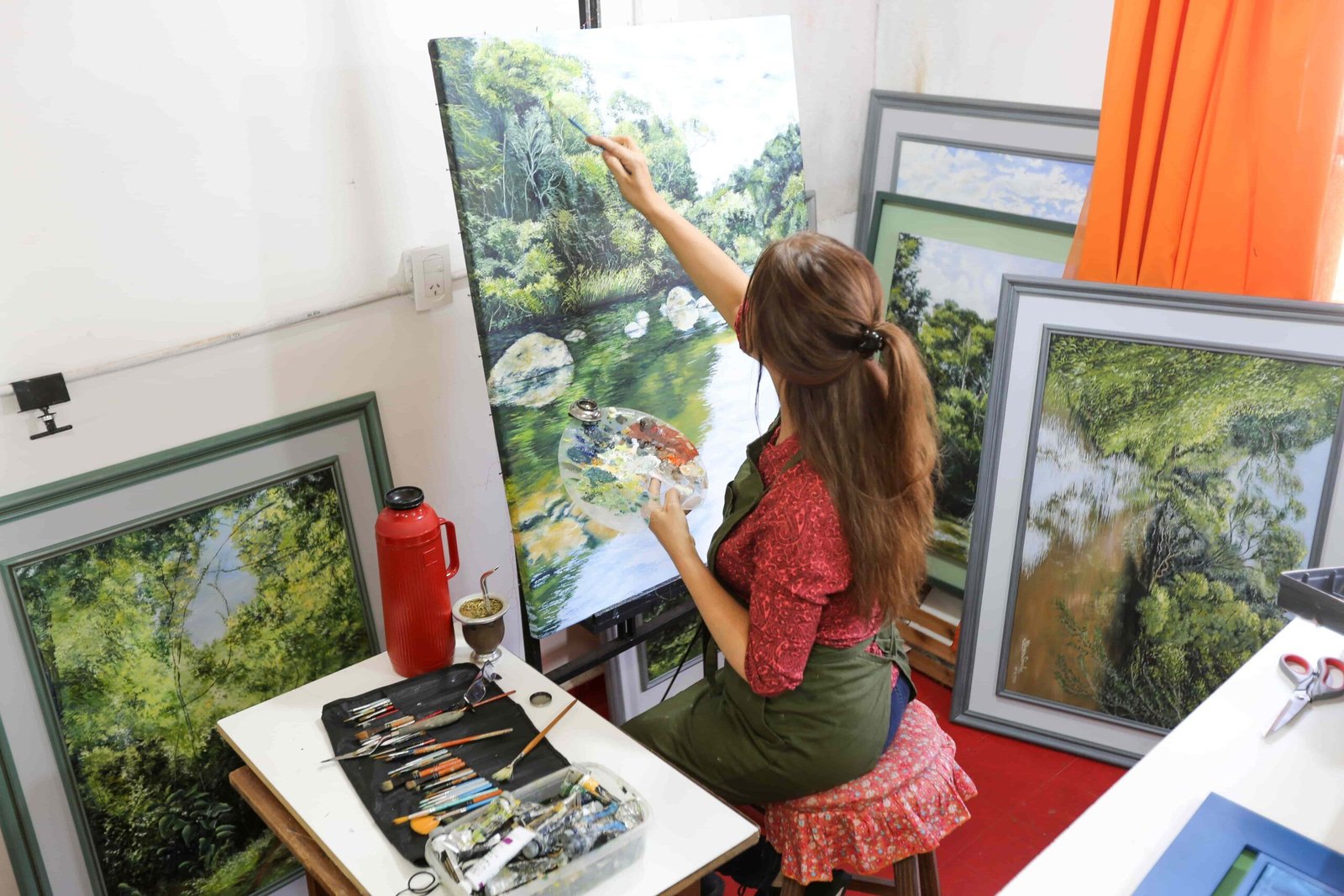 Mónica tuvo su primer contacto con la pintura al óleo a la edad de 25 años, en un taller de pintura de Bernardo Neumann, donde se enamoró de la técnica y se llevó para toda su vida la frase “Nunca dejes de pintar”. Luego vió los paisajes de Ernesto Engel y “tenían magia. Me dije: algún día voy a estudiar con él, quiero aprender la excelencia de plasmar la naturaleza en una obra”. Hoy hace cuatro años que está formándose en la escuela de bellas artes de Engel, “pintando lo que me hace latir el corazón, retratando en óleo a Mi Amada Tierra Misionera. La naturaleza es mi inspiración, mi aliada maestra. Me enseña que estoy en constante transformación y crecimiento. Amo mis paisajes misioneros, sus infinitas formas, colores y procesos”.
