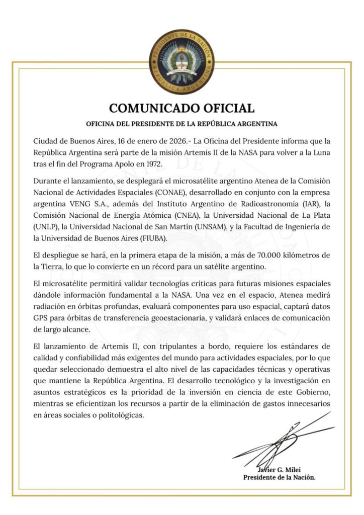 El lanzamiento de Artemis II, con tripulantes a bordo, requiere los estándares de calidad y confiabilidad más exigentes del mundo para actividades espaciales. En ese contexto, la selección del microsatélite argentino constituye una validación explícita del nivel técnico y operativo que mantiene la República Argentina en materia de ciencia y tecnología aplicada.