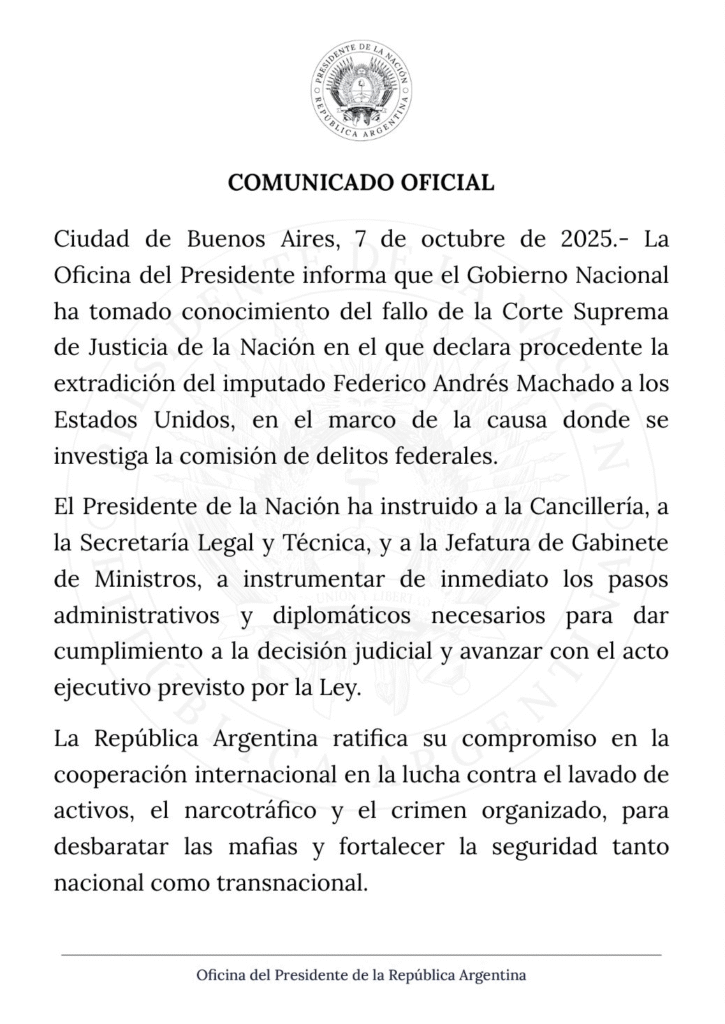 A través de un comunicado, la Oficina del Presidente informó que el jefe de Estado instruyó a la Cancillería, a la Secretaría Legal y Técnica y a la Jefatura de Gabinete a ejecutar de inmediato los pasos administrativos y diplomáticos necesarios para concretar la medida judicial conforme a lo previsto por la ley.