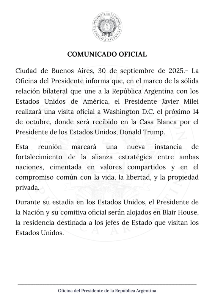 El presidente Javier Milei confirmó de manera escueta y contundente un encuentro de alto nivel con su par de los Estados Unidos, Donald J. Trump. Con un tuit que simplemente decía “REUNIÓN EN CASA BLANCA. Fin.“, el mandatario adelantó la noticia que minutos después fue oficializada por la Cancillería argentina.