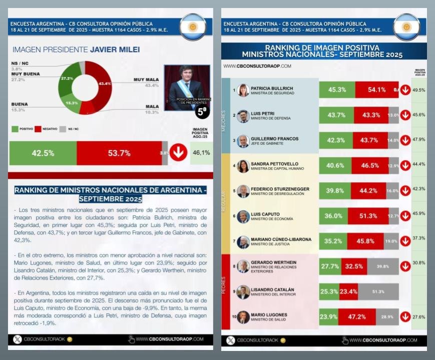 Aunque Milei aún figura en la mitad superior del ranking -quinto lugar sobre diez-, la tendencia preocupa. La caída no fue aislada: todos los ministros de su gabinete también registraron descensos, con un desplome particularmente fuerte de Luis Caputo, ministro de Economía, que retrocedió 9,9 puntos en un mes.