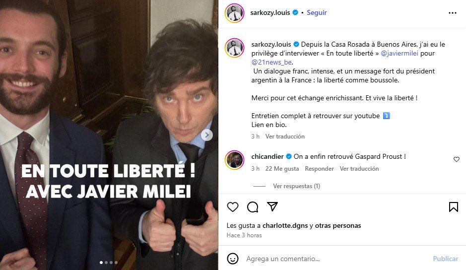 De acuerdo a lo informado por Infobae, Milei tomó conocimiento de los audios de su hermana minutos antes de iniciar la entrevista con Sarkozy, quien a sus 28 años anunció su candidatura en Menton, una localidad de la Costa Azul francesa.
