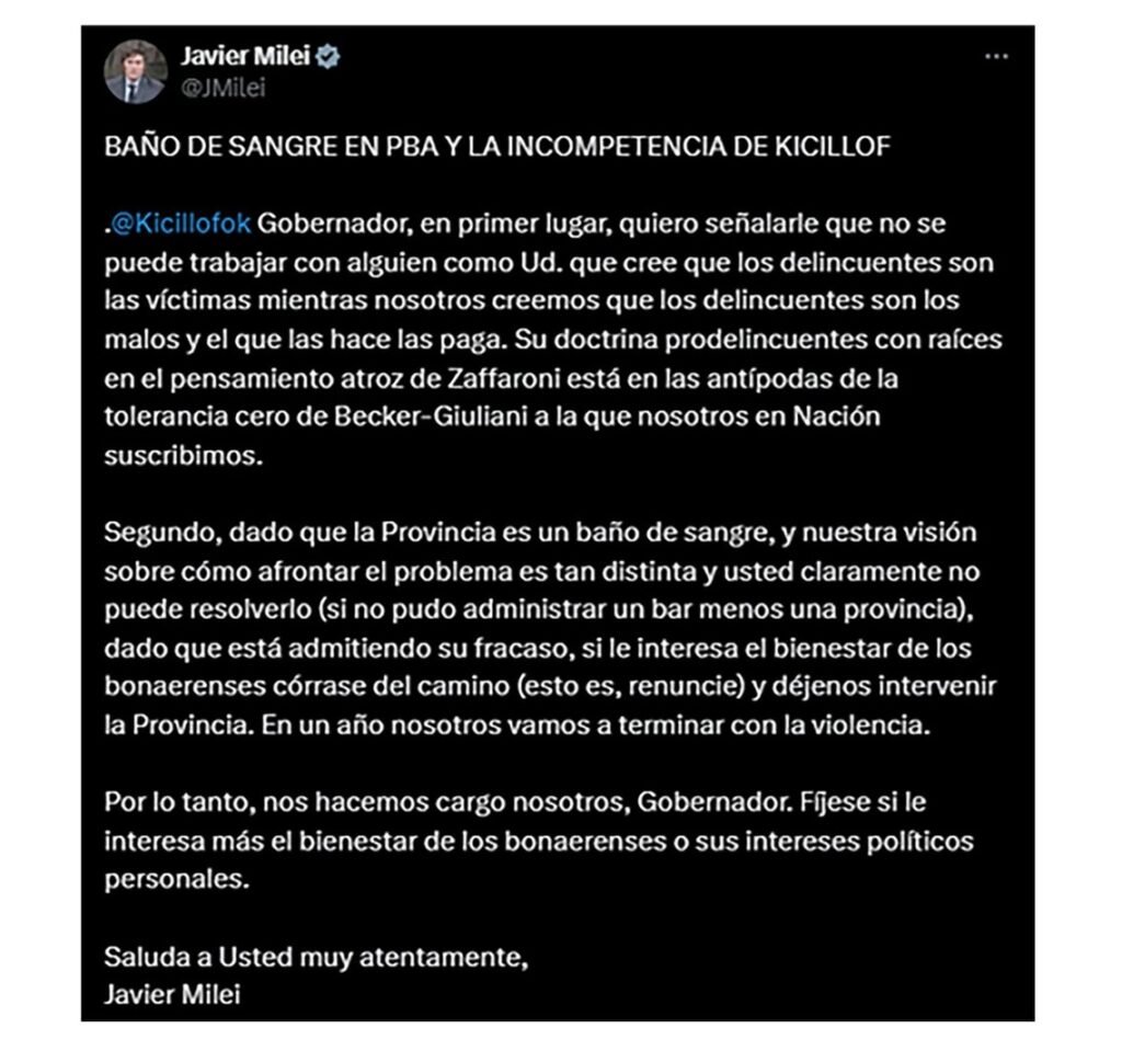 Milei, en su publicación, le habló directamente a Kicillof. “Córrase del camino y déjenos intervenir la Provincia; en un año nosotros vamos a terminar con la violencia. Nos hacemos cargo nosotros, gobernador. Fíjese si le interesa más el bienestar de los bonaerenses o sus intereses políticos personales”.