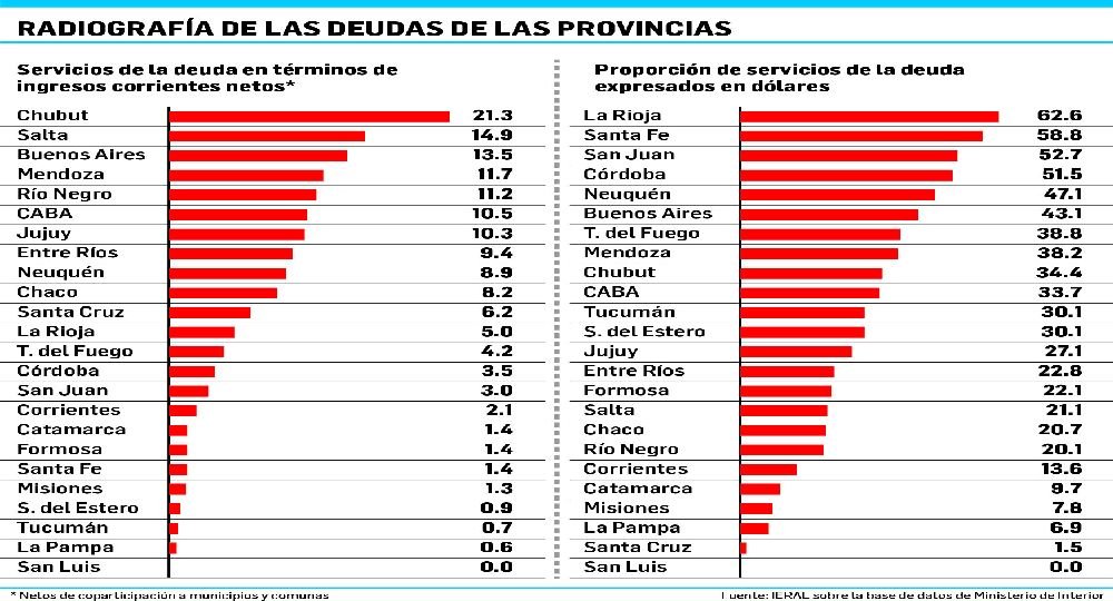 Asimismo, si la lupa se dirige a la proporción de servicios de la deuda expresados en dólares, el listado es encabezado por La Rioja (62,6%), Santa Fe (58,8%) y San Juan (52,7%).