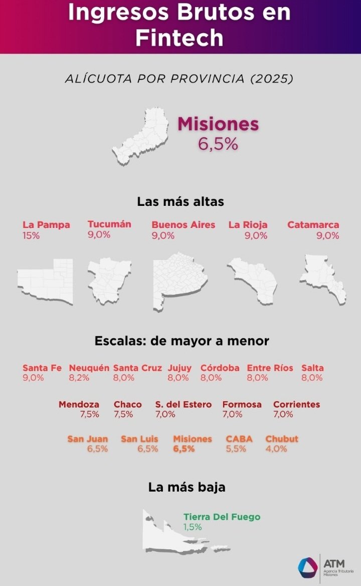 En un contexto nacional de presión tributaria dispar entre jurisdicciones, Misiones se ubica entre las provincias con una carga intermedia-baja para las empresas del sector fintech, con una alícuota de Ingresos Brutos del 6,5% sobre su facturación. Así lo muestra un relevamiento reciente que compara los valores impositivos vigentes para el año 2025 en cada distrito del país.
