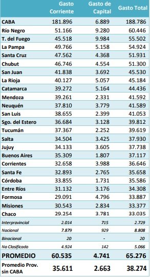 Según el Iaraf, teniendo en cuenta la cantidad de población de cada jurisdicción, el promedio per cápita del país sería de $ 65.276, y si se excluyera a CABA por albergar las dependencias nacionales sería de $ 38.274. Curiosamente, el gasto per cápita en la provincia de Buenos Aires es inferior a la media nacional al alcanzar los $ 37.117, al igual que Santa Fe ($ 35.658) y Córdoba ($ 35.586).