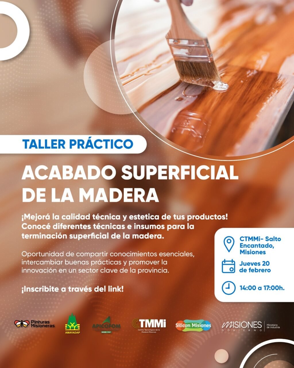 El próximo jueves 20 de febrero se llevará a cabo un taller práctico sobre Terminación Superficial de la Madera en el Centro Tecnológico de la Madera – CTMMi, ubicado en Salto Encantado. Esta capacitación está destinada a operarios, emprendedores y profesionales que deseen mejorar la calidad técnica y estética de sus productos de madera, además de conocer diferentes procesos e insumos relacionados con la terminación superficial.