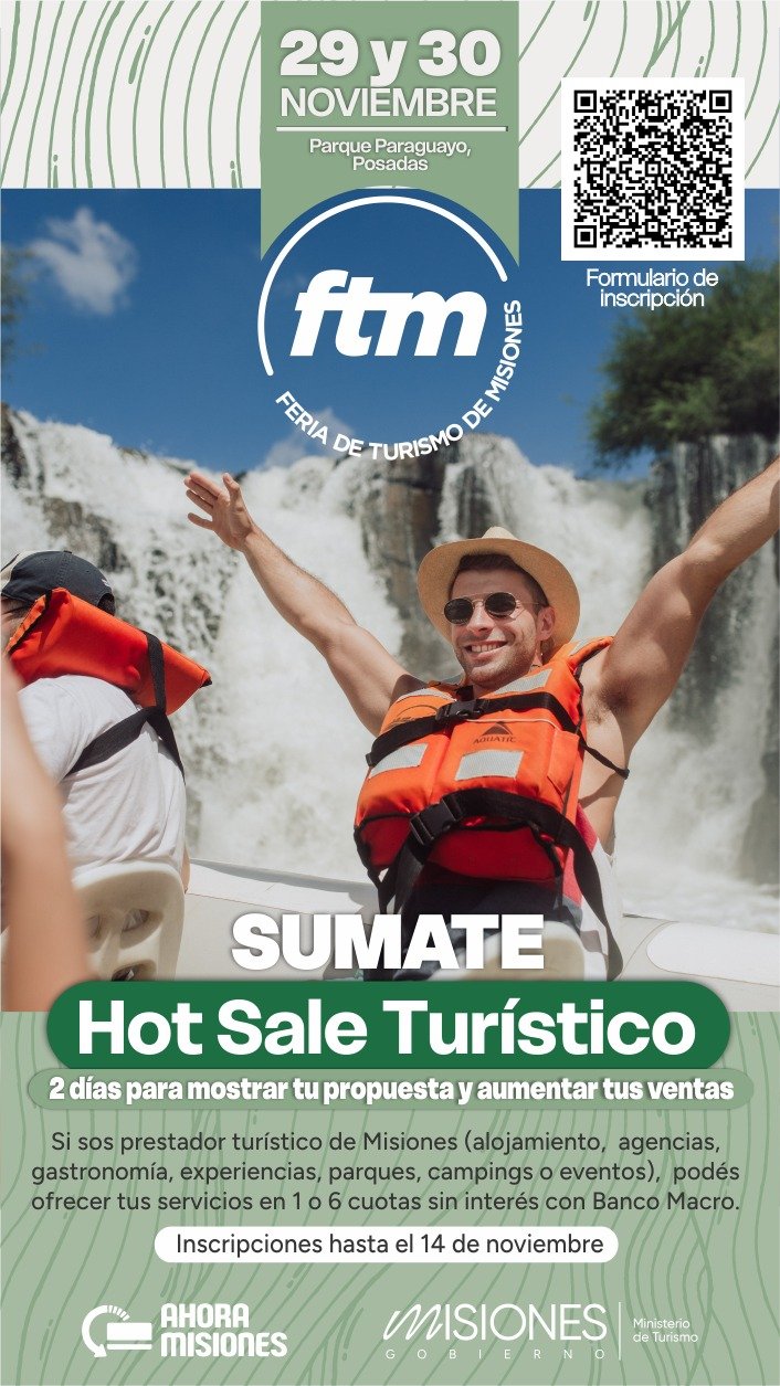 El Ministerio de Turismo de Misiones abrió la convocatoria para que empresas y prestadores turísticos de toda la provincia se inscriban en el Hot Sale Turístico 2025, una acción comercial que se realizará los días 29 y 30 de noviembre, en el marco de la Feria Provincial de Turismo (FTM).
