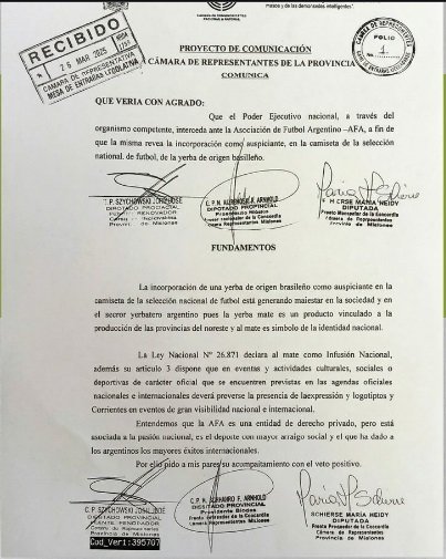 El argumento central del proyecto se apoya en la Ley Nacional N° 26.871, que declara al mate como infusión nacional y promueve su consumo en eventos oficiales. Desde esa perspectiva, la incorporación de una yerba extranjera como sponsor de la Selección aparece como una contradicción con el espíritu de la norma.