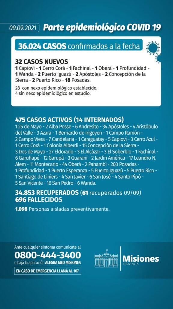 El parte oficial del Ministerio de Salud Pública del jueves (09/09) reveló 32 contagios nuevos y ningún fallecimiento de personas con Covid-19: Misiones acumula 36.024 contagios y 696 muertos desde el inicio de la pandemia.