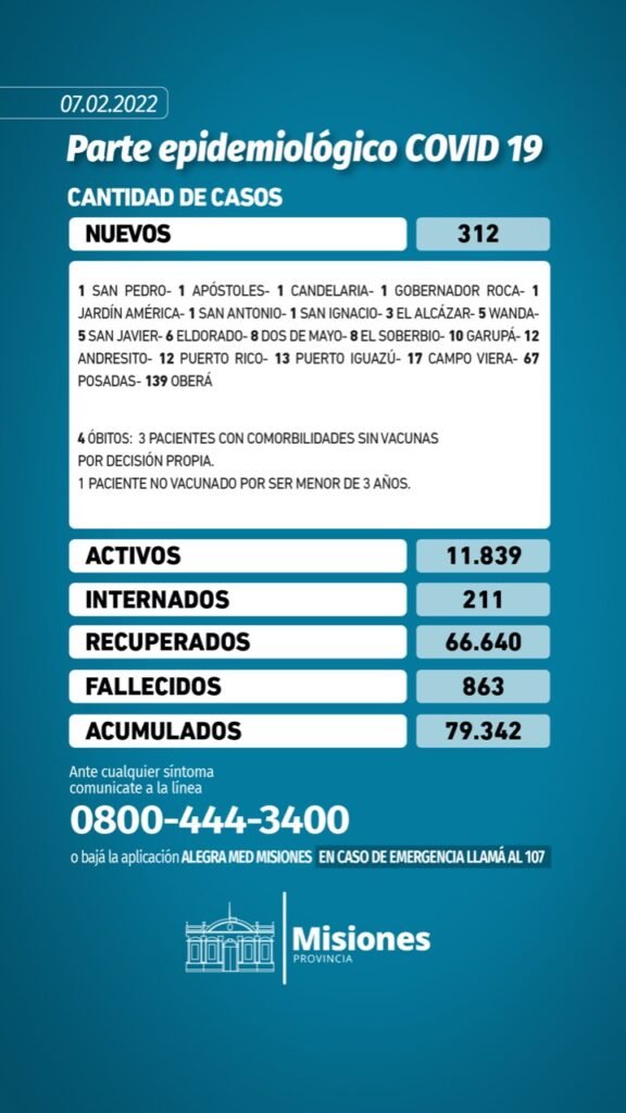 El parte oficial del Ministerio de Salud Pública del lunes (07/02) reportó cuatro fallecidos y  312 casos nuevos de Covid-19 en toda la provincia. De esta manera, Misiones registra 79.342 contagios y 863 muertes desde el inicio de la pandemia.