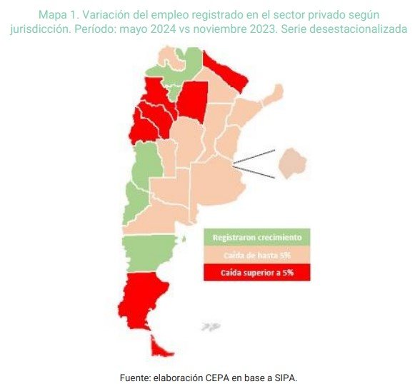 En lo que refiere a jurisdicciones, en mayo de 2024, 17 de las 24 registraron una caída del empleo. En tan sólo seis meses, hay provincias que perdieron hasta 9,9% de sus puestos de trabajo.