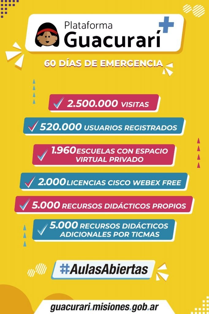 La plataforma Guacurarí ya sumó 2,5 millones de visitas y ya se registran 520 mil usuarios, lo que revela que el uso se extiende más allá de Misiones, que tiene 401 mil estudiantes y 35 mil docentes. El uso de cada usuario se extiende entre cinco y doce minutos.