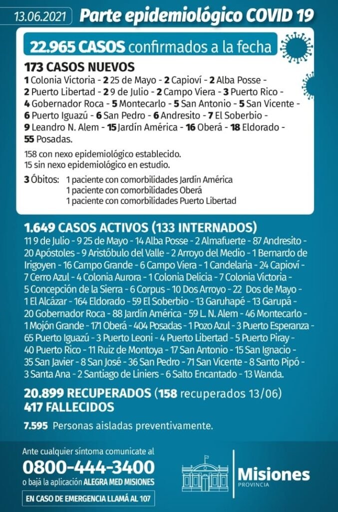 Misiones sumó este domingo tres nuevos fallecidos y se elevó a 417 el número de muertes por coronavirus. Los fallecimientos se registraron en Oberá, Jardín América y Puerto Libertad.