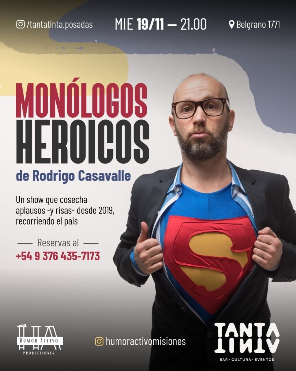 El próximo miércoles 19 de noviembre a las 21 horas, el bar cultural Tanta Tinta (Belgrano 1771, Posadas) recibirá Monólogos Heroicos. El unipersonal de Rodrigo Casavalle que desde 2019 recorre el país con un formato que fusiona teatro y stand up. Que ya fue visto por más de 70.000 espectadores.