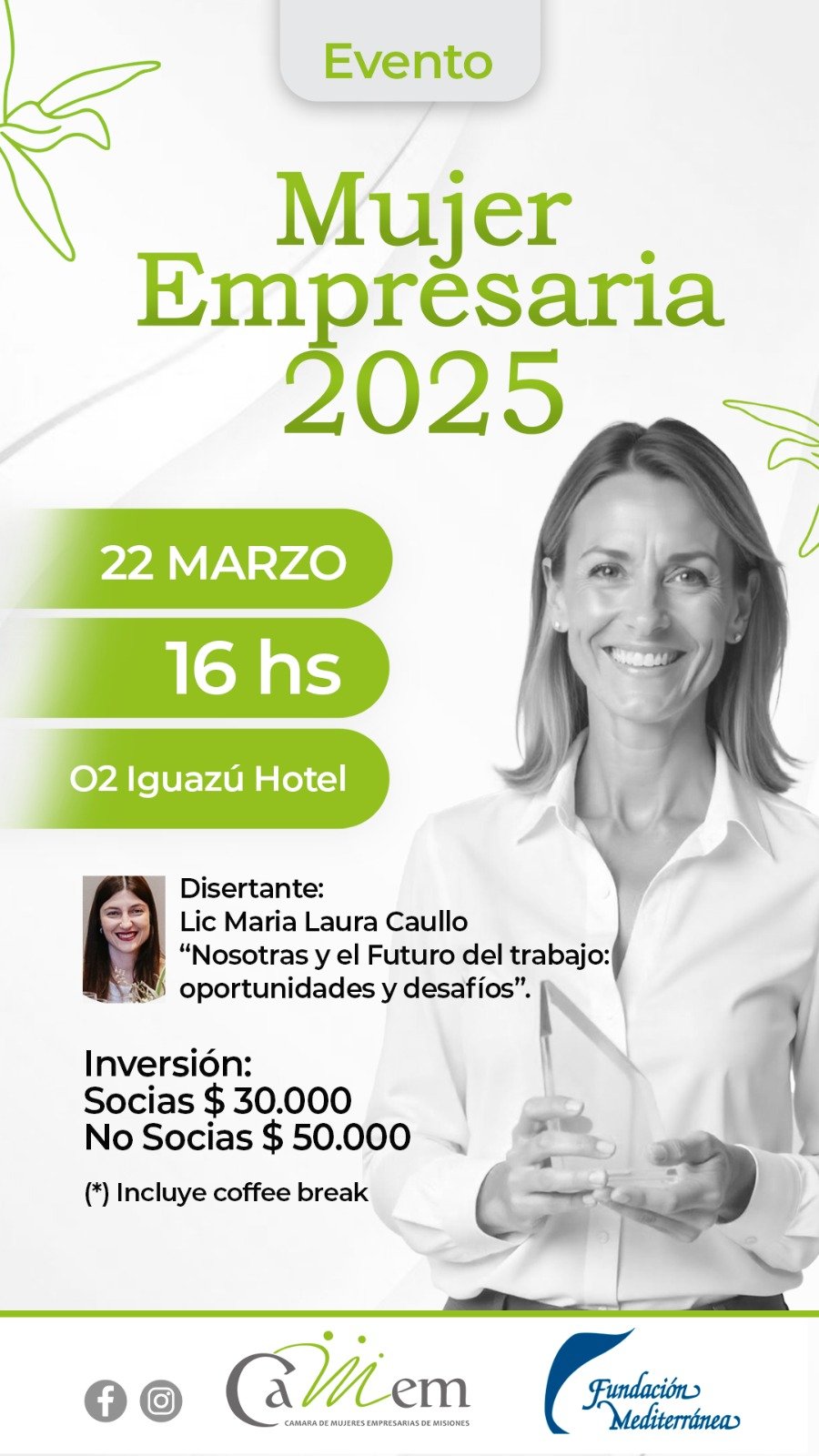 El próximo 22 de marzo se llevará a cabo en el O2 Iguazú Hotel, en la provincia de Misiones, el evento “Mujer Empresaria 2025”, un espacio destinado al debate y análisis sobre el futuro del trabajo desde la perspectiva femenina. La actividad, organizada por la Cámara de Mujeres Empresarias de Misiones (CAMEM), contará con la disertación de la Licenciada María Laura Caullo, investigadora de la Fundación Mediterránea.