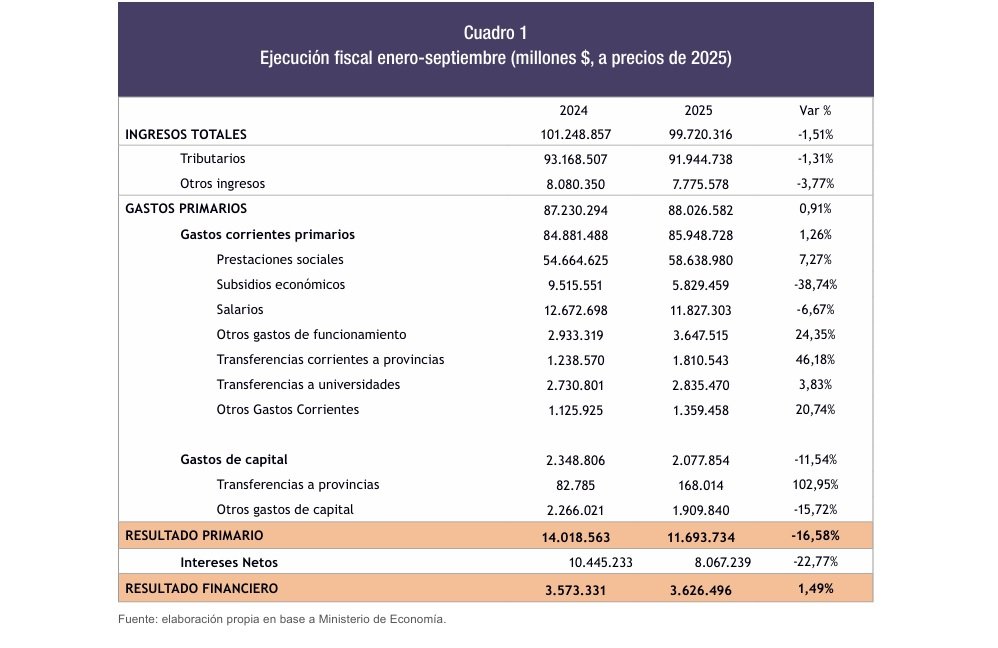 Con tres trimestres del año cerrados, lo que queda de 2025 se dará de forma casi inercial. A septiembre, el superávit financiero registró $3,6 billones, un número muy parecido al observado en el mismo período del año pasado (cuando se expresa a valores constantes). Por su parte, el resultado primario se ubicó levemente por encima de los $8 billones, reflejando una caída de casi 17% con respecto a 2024. Este contraste entre el deterioro del resultado primario y la persistencia del resultado global se explica por el uso de instrumentos de deuda capitalizable en el mercado local. Estas emisiones no registran intereses, sino que aumentan las amortizaciones. Así, su efecto en las necesidades de financiamiento es nula, pero en la exposición del balance fiscal (“arriba de la línea”) reducen las erogaciones.