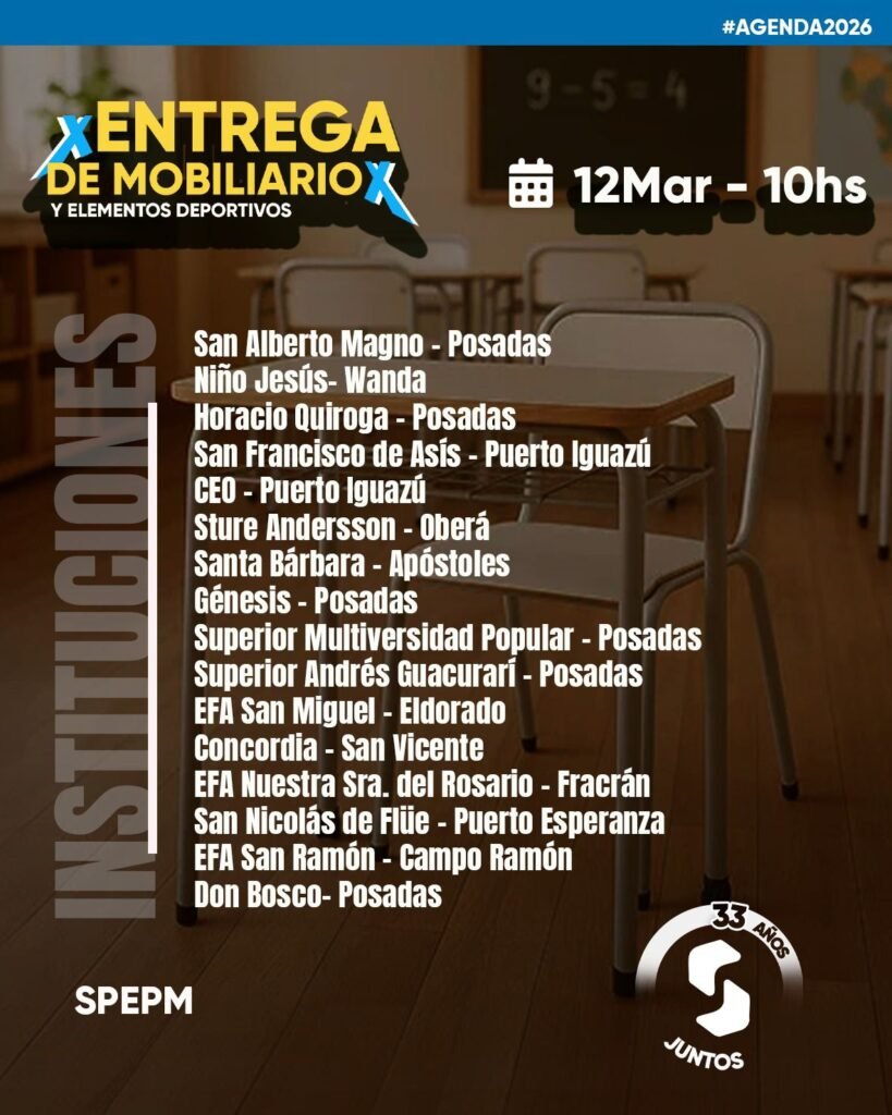En esta oportunidad, recibirán mobiliario escolar y elementos deportivos establecimientos de las localidades de Posadas, Wanda, Puerto Iguazú, Oberá, Apóstoles, Eldorado, San Vicente, Fracrán, Puerto Esperanza y Campo Ramón, llegando también a instituciones ubicadas en zonas alejadas y fortaleciendo las condiciones para el desarrollo educativo en todo el territorio provincial.