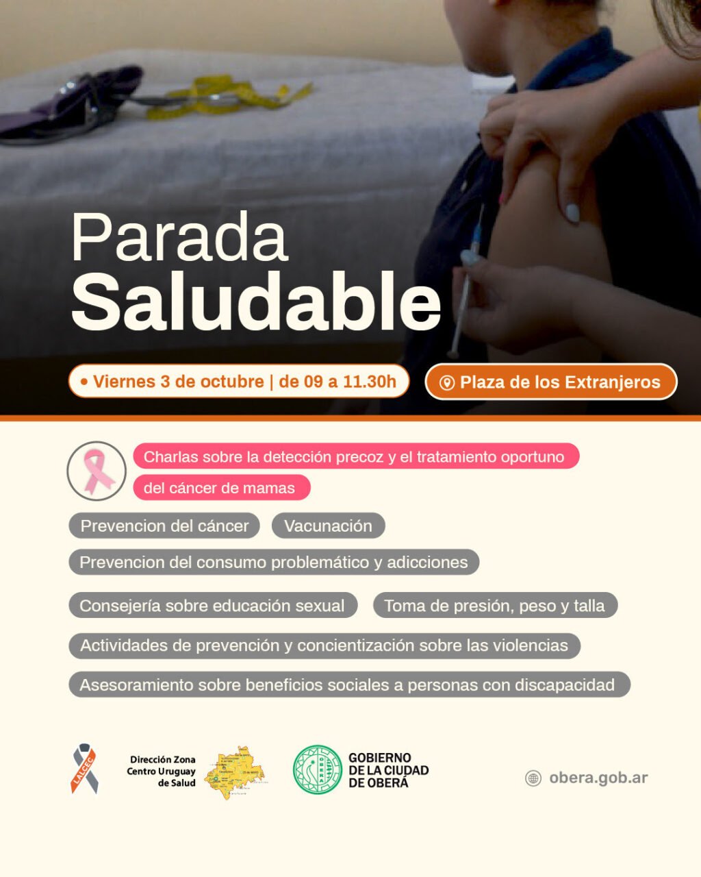 Mañana viernes 3 de octubre en el marco del mes de la detección temprana y tratamiento oportuno del cáncer de mamas, se realizará una nueva edición de Parada Saludable.