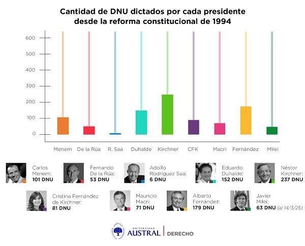 El uso de DNU en cifras: desde la reforma constitucional de 1994, se han dictado 943 DNU, con Néstor Kirchner (237), Alberto Fernández (179) y Eduardo Duhalde (152) liderando el uso de esta herramienta. El presidente Javier Milei ya ha emitido 63 DNU en poco más de un año de gobierno.