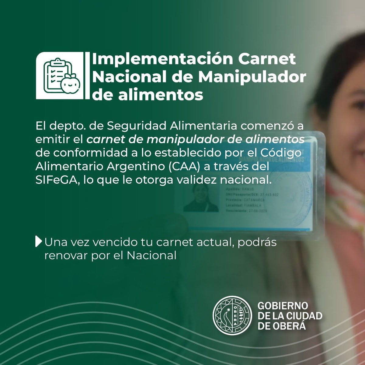 El Departamento de Seguridad Alimentaria comenzó a emitir el carnet de manipulador de alimentos de conformidad a lo establecido por el Código Alimentario Argentino (CAA) a través del SIFeGA, lo que le otorga validez nacional.