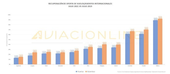 De acuerdo a datos obtenidos por Aviacionline, Argentina es el país con menor recuperación en la oferta de asientos internacionales de Latinoamérica y el Caribe en julio.