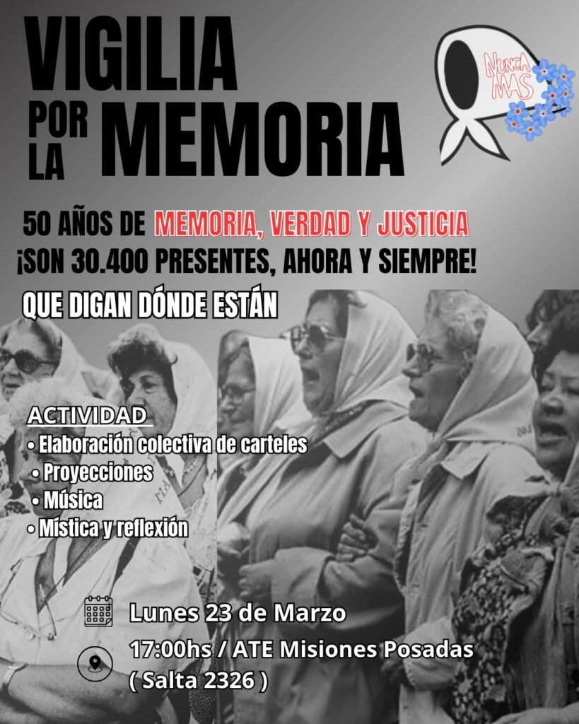 La secuencia de actividades también tiene diseño político. La vigilia del lunes 23 en la sede de ATE Misiones propone un formato de construcción previa, con elaboración colectiva de carteles, proyecciones, música, mística y reflexión. Es decir, no solo convoca a asistir; convoca a producir identidad y clima político antes de la marcha central. La marcha del martes 24, en tanto, se organiza desde una esquina emblemática del centro posadeño, Mitre y Buenos Aires, con horario matutino, una elección que combina visibilidad pública y ocupación temprana del espacio urbano.