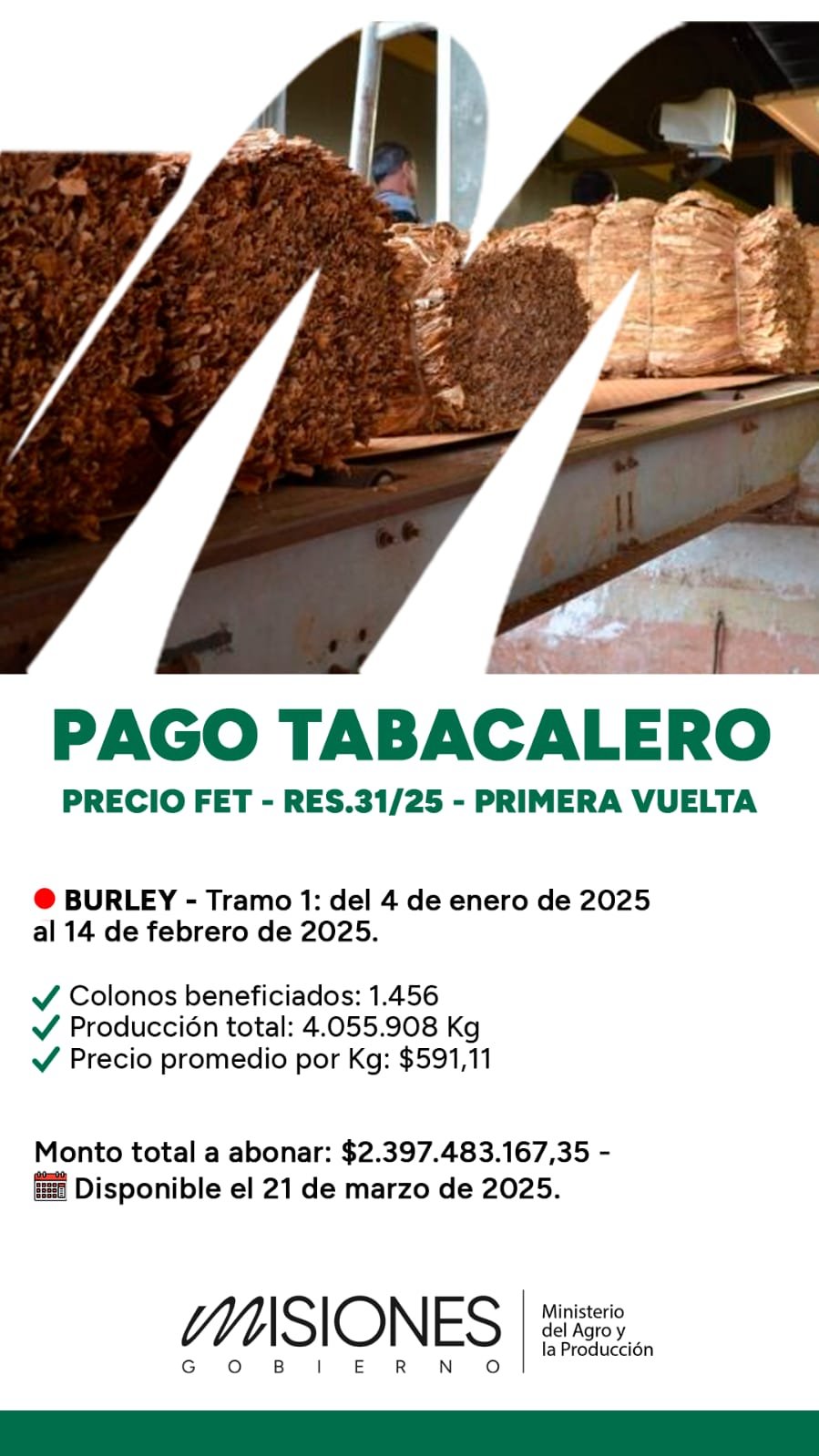 En total, el monto a abonar asciende a $2.397.483.167,35, lo que contribuirá a fortalecer la actividad tabacalera y dinamizar la economía en las zonas productoras.