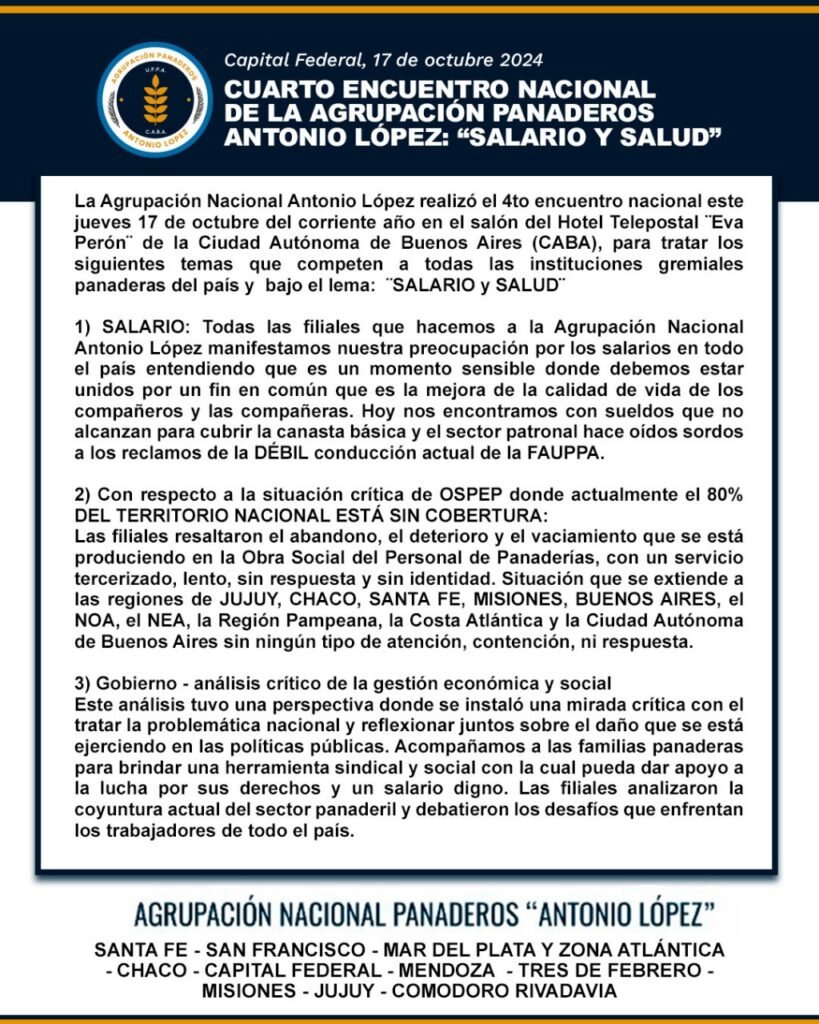 La Agrupación Nacional de Panaderos «Antonio López» que conduce José Luis Sánchez llevó a cabo su 4º Encuentro Nacional con fuerte presencia y respaldo de filiales de Jujuy, Mendoza, Comodoro Rivadavia, Chaco, Santa Fe, Misiones, Mar del Plata, Tres de Febrero, Jujuy, CABA, San Francisco (Córdoba) y Mendoza.