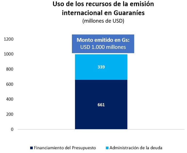 Según lo informado, de los US$ 1.000 millones emitidos, aproximadamente US$ 339 millones se destinarán a administración de pasivos —compra y venta de bonos o “bicicleteo”—, mientras que unos US$ 661 millones financiarán el presupuesto y proyectos de inversión.