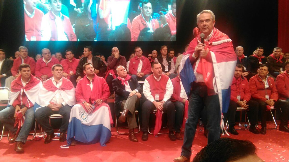 Con la polca colorada de fondo, ingresaron juntos el presidente Horacio Cartes y sus elegidos como precandidatos a la chapa presidencial, Santiago Peña y Luis Gneiting. Miles de dirigentes de Honor Colorado los recibieron con hurras en el salón auditorio el Centro de Convenciones de la Confederación Sudamericana de Fútbol (Conmebol), en Luque.