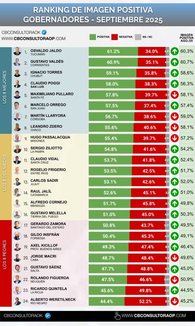 El ranking de gobernadores muestra en la cima a Osvaldo Jaldo (Tucumán) con un 61,2% de imagen positiva, seguido por Gustavo Valdés (Corrientes) con un 60,9% y Ignacio Torres (Chubut) con 59,1%.