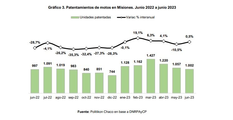 Por su parte, durante junio en la provincia de Misiones se registraron 1.002 motos patentadas, mostrando una leve suba del 0,5% interanual. Cabe señalar que, comparando con los meses de junio de años previos, este 2023 fue superior al 2022, 2020 (+47,1%) y 2019 (+46,5%), pero fue inferior a junio de 2021 (-28,4%).