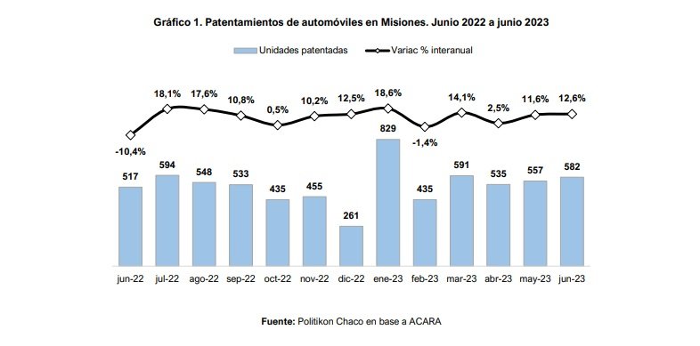 En este marco, en la provincia de Misiones se registraron 582 automóviles patentados, presentando un crecimiento del 12,6% interanual (y +4,5% en la comparación mensual). Se trata del mejor junio desde, por lo menos, el año 2019, ya que además de posicionarse 12,6% por encima de junio del 2022, lo hace 0,9% contra junio 2021, 19,0% vs. junio 2020 y 15,5% contra junio 2019.